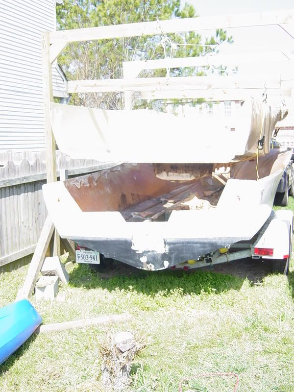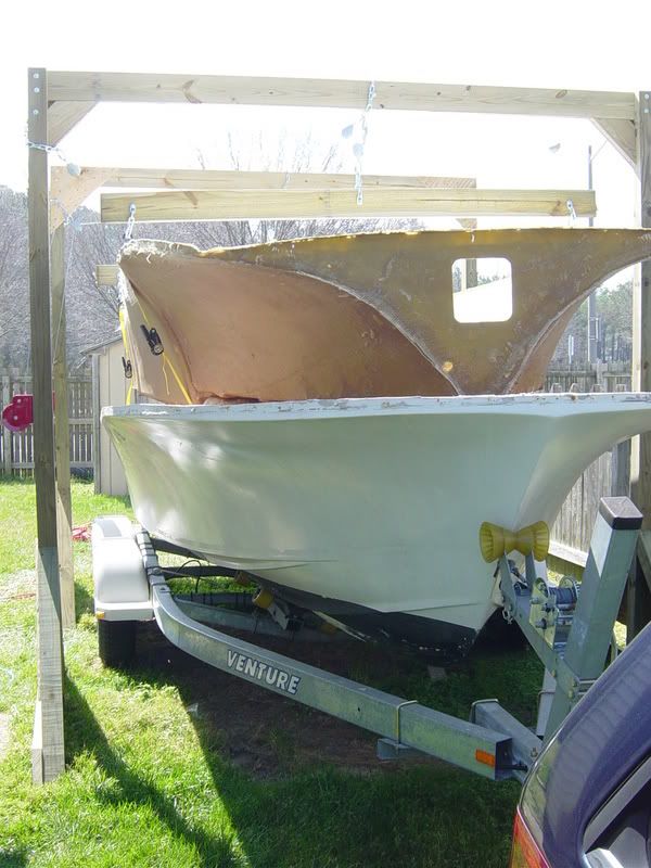 Ok, sorry I'm a little late, but here's where I'm at this weekend: I finally got my "cranes" ::) put together and set up, lift the inner liner out from the hull and put the hull in the driveway so I could get it cleaned out. Once I started working on / inspecting the hull I found a few things that are going to have to be addressed. First, four of the outer bulkheads have seperated from either the hull or stringers. Second, there are spots on the stringers where the glass is not stuck to the wood. Third, the moister trapped by the foam for so long seems to have taken a small toll on the fiberglass.