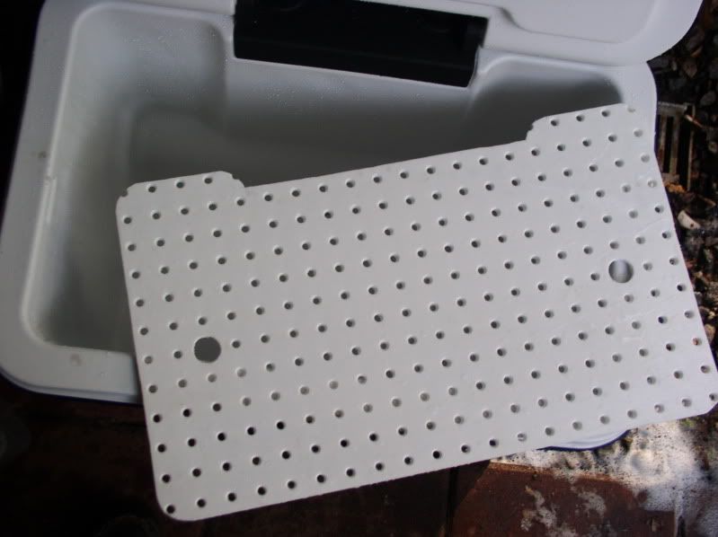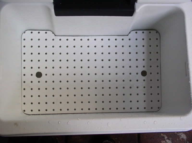 Made out of PVC pegboard, cut to fit snugly, finger holes are a must. This application will work excellent when using dry ice too, no worry about freeze burning. Also keeps the ice a little more protected to last longer. Usually I freeze 6x6x6 plastic tubs filled with water, put the whole thing in the bottom, this also keeps the pegboard level. http://i175.photobucket.com/albums/w...erdivider2.jpg http://i175.photobucket.com/albums/w...erdivider1.jpg |