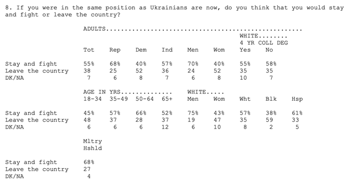 Question 8: If you were in the same position as the Ukrainians are now, do you think that you would stay and fight or leave the country? https://pbs.twimg.com/media/FNTCCVJW...g&name=900x900 https://pbs.twimg.com/media/FNTCCWOX...png&name=small :oh: |