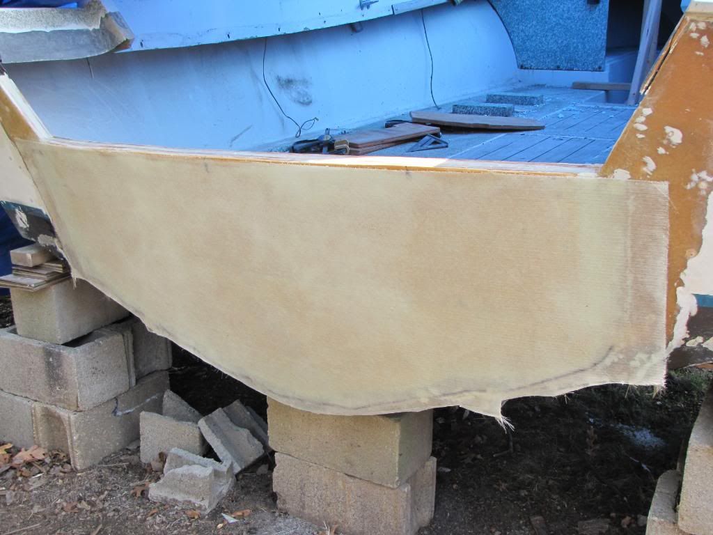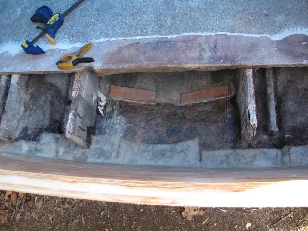 1975 V20, planning on sistering new resined marine ply thu bolted, then glass over both and also glass to transom. In that pic of the outside I hadn't put any resin on yet except enought to wet it out, needs more coats then fairing. Planning on glassing the top also. Thanks for all your comments, it all helps.