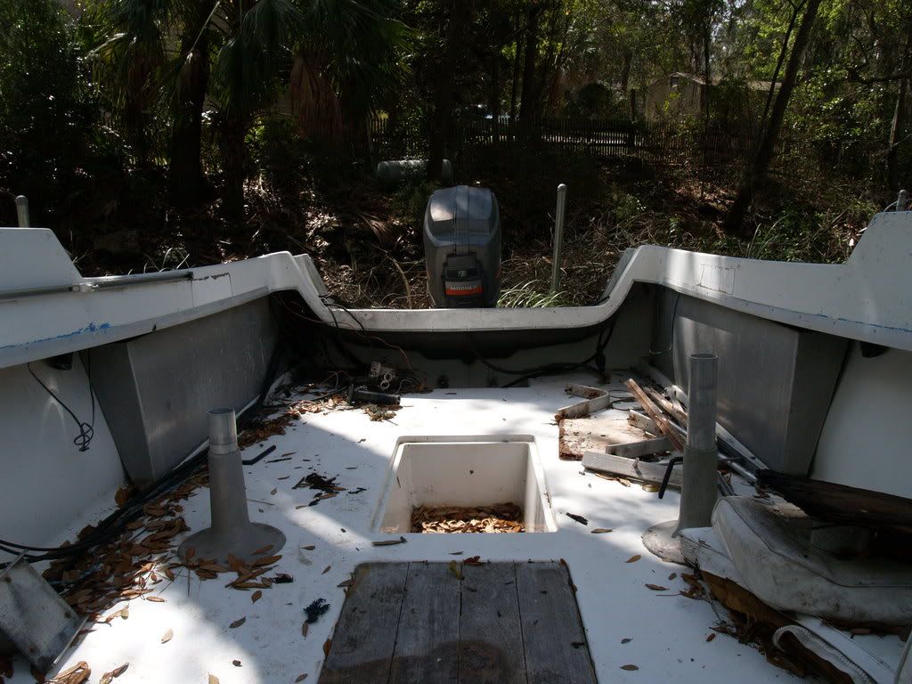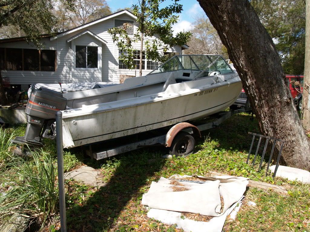 Granddaddy bought the boat new in "75 for $4995 with a single axle trailer and 125 Evinrude. Being in poor health sold it to his nephew about 1981. Not receiving payment for some time he asked Daddy to repossess it. Finding the boat without a motor (supposedly blown), Daddy informed Granddaddy and he sent money for a new motor. Daddy bought and installed a new 140 Evinrude ($2200) about 1982. The boat sat for about two years unused till after Granddaddy died and Grandma asked Daddy to sell the boat. Having done all the work he bought it, however the motor had a defect with the piston grooves too close to the top and was now out of warrenty and politely blew the carbs off. Daddy let a childhood friend (Fred) sell the boat to a fishing buddy. Fred's buddy died sometime later and Fred sold it to his son in laws father. Well he died later (about two years ago), so the son in law had the boat unused for this time now with a 150 Mariner on it. A couple weeks ago Fred asked Daddy if he knew anyone interested in the boat, so $700 later it ended up with me. |