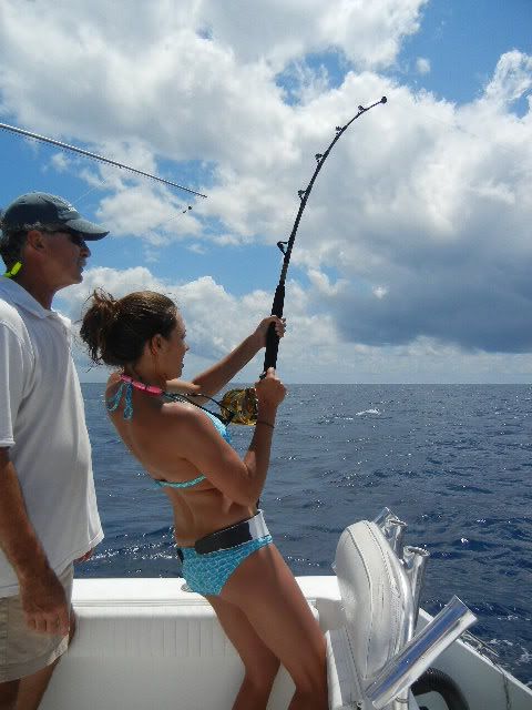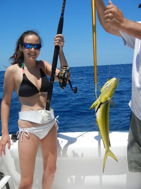So...this weekend I was down there to help youngest daughter move, seas were right, time was right, so we all pushed away from the dock aboard my old friends boat, at Toler's Cove at 4:30 am and headed out to a spot about 45 miles off...running like that in the dark can have it's moments, but this one went w/out incident...so a little after sunup, we've put the lines out and had had some hits, but nothing in the boat...went to 2nd spot...picked up a few med size dolphin...Lauren(Youngest) got her 1st offshore fish...