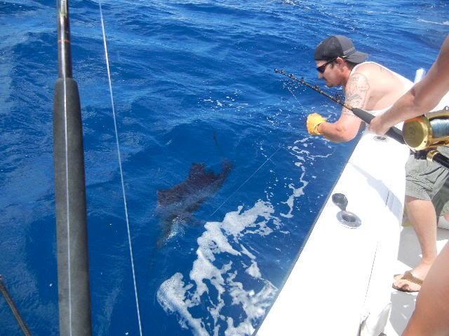 This kid is STOKED and although she's been getting more and more acclimated to fishing, this REELY did it!!...w/a little help from her friends, her boss on left and his mate on right we get some quick pics and release the sail none the worse back to grow up and crash another line later on.