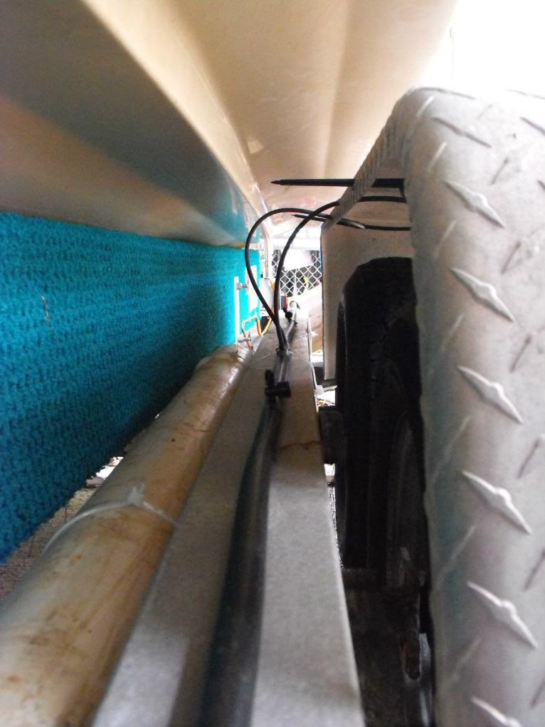 ![]() bladder tank which holds 5-6 gallons ![]() pipe running down the frame ![]() flex pipe running behind wheels with sprays attached ![]() open the valve and spray after you launch ![]() go fishing and don't worry about your trailer |