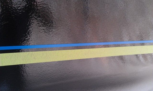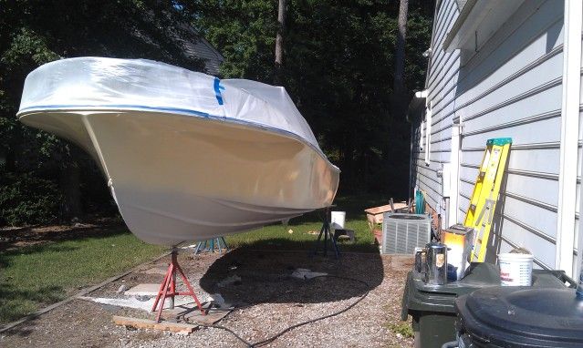 This is the last " before" pic of the boat before painting. I had determined that the anti fouling bottom paint was hard epoxy. Since it was hard epoxy I determined I could paint over it with epoxy primer with fairly good results. Had this been an ablative bottom paint, I don't think I would be able to just paint over it. I sanded all of the bottom paint off of the freeboard of the boat and heavily feathered the rest of the bottom using a DA sander and 120 grit sand paper. I then wet sanded the hull sides with 220 grit and began masking. Disregard the blue tape where the boot stripe would be. I was just trying to get a visual.