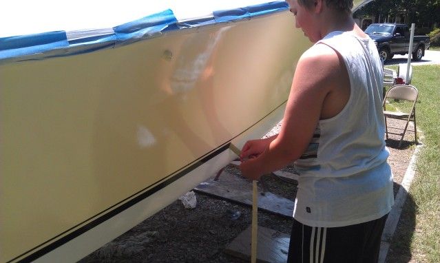 ![]() I then sprayed the Devoe 201 2 part epoxy primer using a binks model 2001 1/2 gal pressure pot with a 63 PB ss fluid nozzle. This primer was very easy to spray and covered well. I would say all paint was reduced by approx. 10% ![]() Sprayed a 6" to 8" band in the area that my boot stripe was to be located. Also used this time to fill ant small imperfections with spot putty. ![]() Using 3m 1" fine line tape and 1/4" vinyl pinstripe tape I masked off the stripes. This tape when revealed will be the finished boot stripe. ![]() ![]() Next step: Spray over the masking tape stripes with the same black paint. This will insure that the edges are sealed and the finished lines will be crisp. After the black dried I sprayed another coat of 201 primer over pretty much the entire boat. This was to seal in the spot puttied areas and to prevent the black paint from showing through the yellow. ![]() At this point a chose to paint the yellow hull sides. Only because I had some runs on the black coat over the tape, which ran down onto the white area. I would have had to wait a day to sand the runs out before I could paint the bottom white. Given the choice. I would be much easier to paint the white bottom first and mask off the bottom than to mask off the yellow sides. Oh well...whatever works. ![]() After the color was sprayed on the sides. I masked from the lower 1" stripe up to the rub rail and sprayed the bottom. After some dry time the masking tape was pulled from the black boot stripe area and the stripes where revealed. This was the moment of truth. What a thrill to see it all come together. After all the masking was removed from the stripes and hull sides, a final coat of 379 clear was applied. ![]() ![]() ![]() ![]()