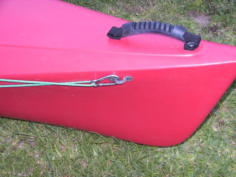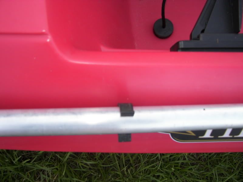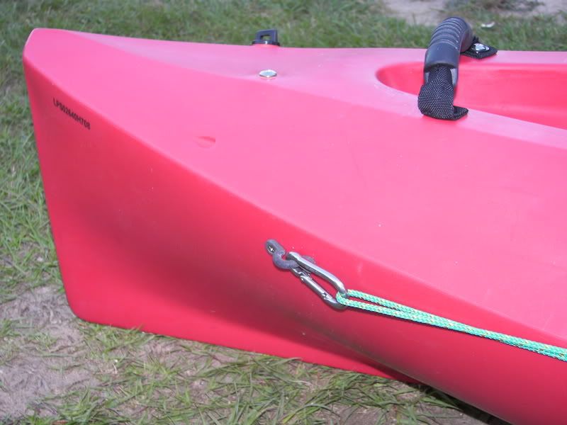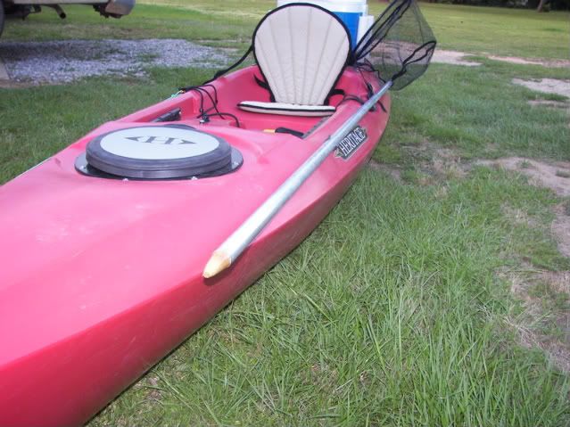 I made an anchor trolley. I like the loops being lower on the yak to keep it out of the way more. I used small stainless caribeners at each end and one large one in the middle so I can split it and use it for a dock line. The small ones on the end really help it slide well. ![]() Front: ![]() Rear: ![]() Here is the stake pole I made: Clip to hold the front in place.... ![]() ![]() I made it with a piece of thin wall 3/4" aluminum stock from Lowes. I cut it down from 8 to about 7'. I sealed the "handle end" with a rubber cap I got from lowes as well thats for chair legs. Obviously in the picture its too far foward. It actually tucks into the lines of the yak pretty well and out of the way when slid back some more. ![]() Here it is after I glued it on with epoxy: ![]() I made a plug and tip out of a wooden dowel that I shaved down to fit really tight. It is in with epoxy and sealed with it all over. ![]() Since it is sealed and hollow it floats. I tired it in the pool. ![]() Total cost for the pole...14 bucks. ![]() let us not forget the all important sponge. LOL ![]() ![]() ![]() Of course I added four rod holders to the ice cube chest as well. I also added paddle holders...think thats what you call em... on the sides by the handles.... I made them with some ball bungees like these from Lowes...just a few bucks for 10 of them. ![]() Ive still got a couple little details to do. I'm thinking of installing a couple of criss crossed bungees behind the front hatch to hold down the life jacket for quick access. The small hole would prove difficult in a hurry.