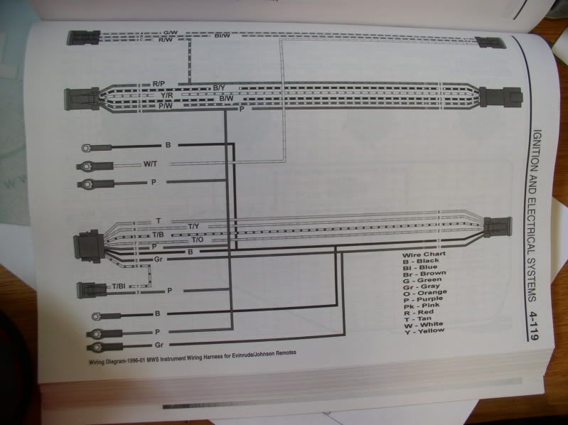 i'm at the coast so no books here but the blacks are grounds the purple are usually the keyed hott wire for gauges the tan is uaually the warning horn wire color. the gray is your tach wire and the white/tan is the tilt/trim gauge. look in the midsection for the trim sensor.