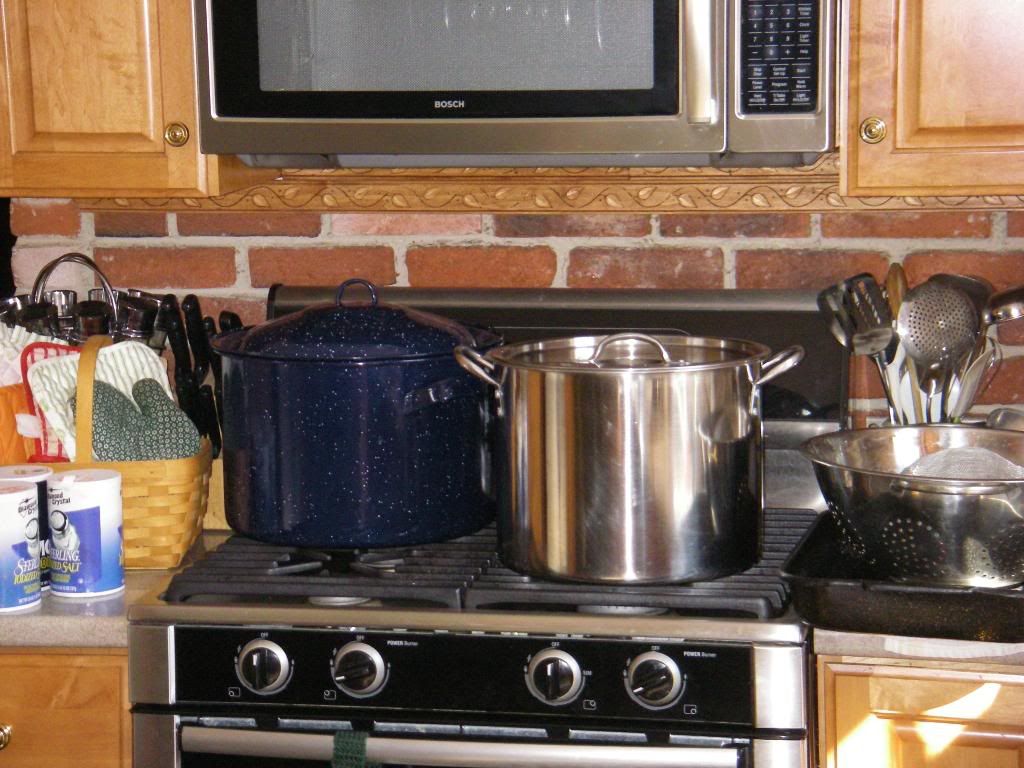 Inside the jars and lids have been boiled (sterilized) and are awaiting. You pour yourself a big glass of wine and ice and deliver the big pots one at a time to the CEO and the in-law equivalents who ladle the hot juice into the jars and place the lids on.