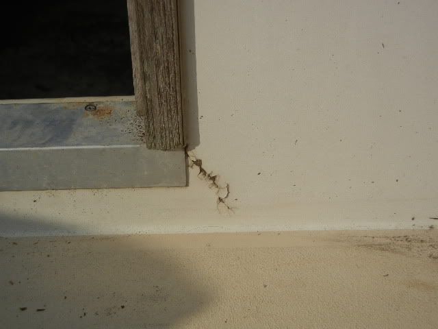 I have cracks just like that on mine....except mine are a matching pair right and left, inside and out.....previous owner told me it happened when somebody broke into his cuddy years ago and kicked in his door. I ground them out a little , filled them with epoxy resin and then had a new ss threshold made up that extended out to cover the cracks on the outsides.....I'll post a pic later...let me know if you want to do the same...i bet the dimensions are identical i could bend one up and send it down to you. I think it does look a little like a patch of sorts but it definitely looks better than what it would have turned out like if i tried to hide it with gelcoat or paint.