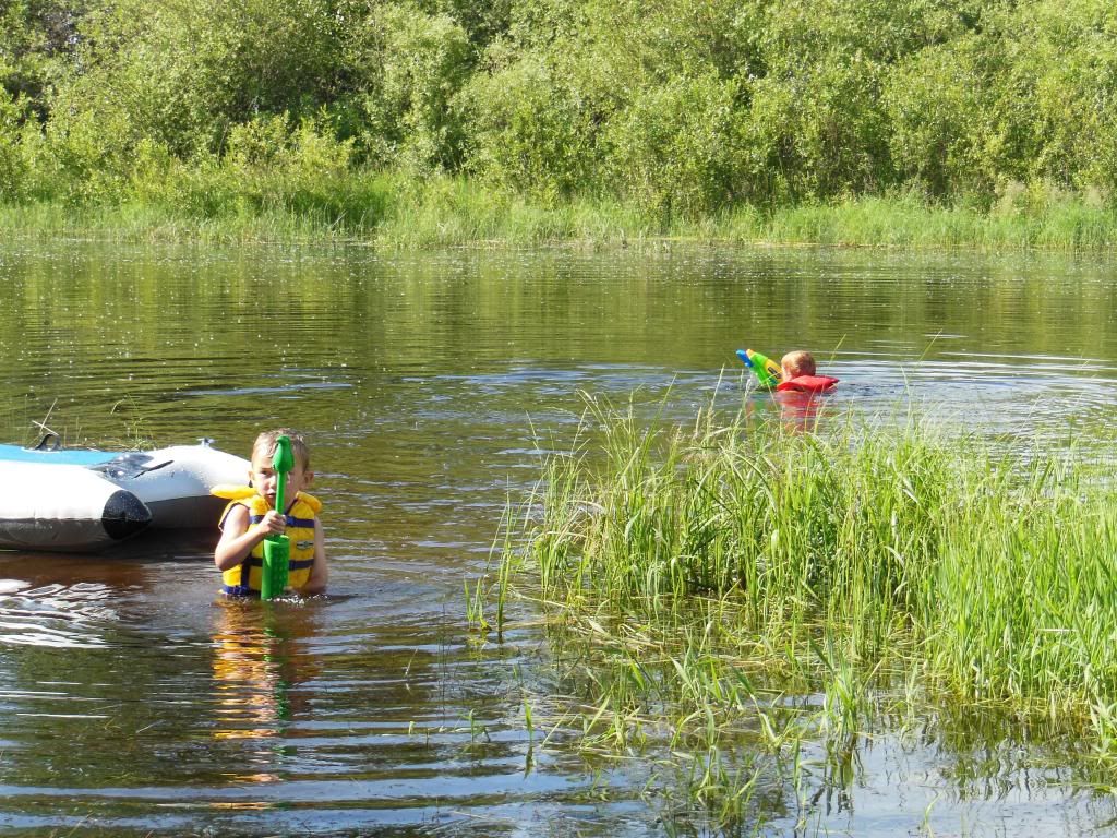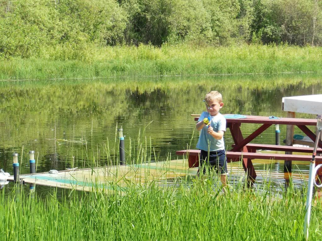 Spent the weekend up at our lake lot up on Lesser Slave Lk.We couldn't get out on the lake with all the rain we got the lake is to high to get under the train bridge. Kalum and I fished in the creek and got a few nice walleyes for supper. Kalum gave me a lesson on how to catch em AGAIN. I didn't get any of the fish in the photos they only made it as far as the kitchen . I filleted and cut them up into 1" cubes soaked them in soya suace and spices for an hour. I drained the fish and wraped them up in bacon and BBQ'd in a tin tray untill crisp  . Walleye scallops The O'l Superman rod at it again  I will watch the rods Dad I won't leave! (not my boat!)  Kalum trying his luck neting bugs and stuff!!!  The boy's cooling off from a hard day of playing and icecream.