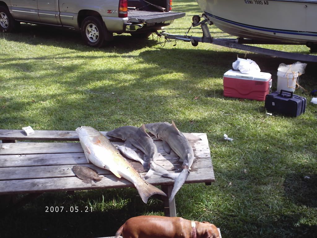 we hooked up on about 24 sharks today, landed 17 and only two that we landed were legal. we lost some that we actually got to see that were close to 5'. only one trout and one flounder. all in all a good day. the red fish was pretty darn big to! ;D