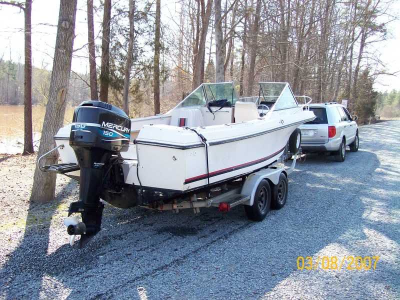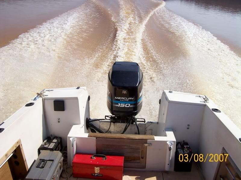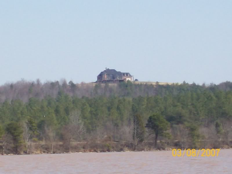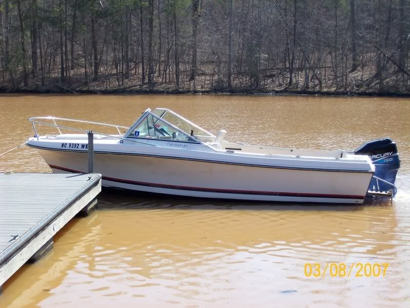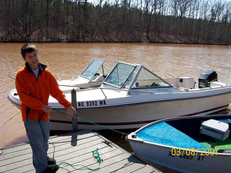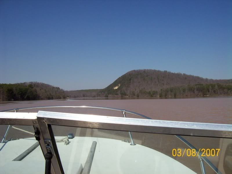 Well boys, she is a great boat and a great motor. *My son and I along with a buddy in his boat (just in case we broke down) took the V out for a 2 hour cruise today. *My son has been out of school all week with a fever, luckily it broke today so we both could go. I now have complete confidence that the motor is rid of any overheating problems. *I ran it for 2 hours at all speeds and it performed flawlessly. I would not hesitate to take the family offshore with this motor. I made a video of the trip also, I'll have to figure out how to get that on here. We went to Tuckertown Res. *The water, as you can see, was very muddy.     Deep in the heart of the Uwharrie Mountains   I think this might be Fishbone Jr's place.