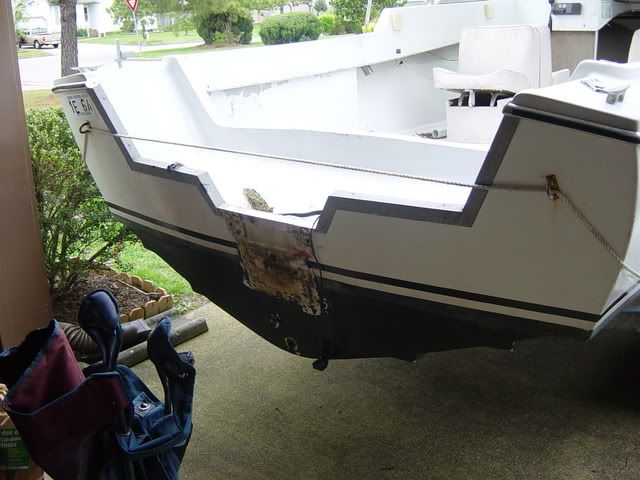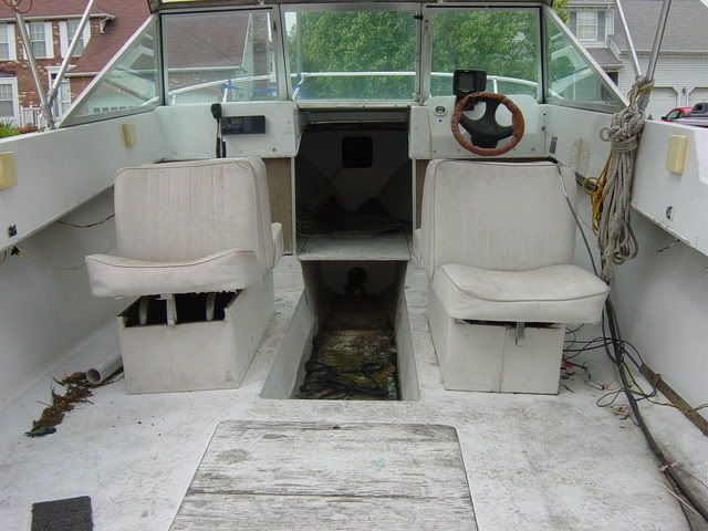 Jeff, she's a little dirty, but I gotta tell ya, that boat looks pretty good...no question you got some work ahead, but honestly it's more than I expected from your prior description...when I first got my '74, the motor was too close to the single drain hole in center of splashwell...real PIA...new motor clears that hole and allows qick drainage...when you hang a motor on her MAKE SURE that drain hole is CLEAR...if you redo transom, fill that hole and do one on each side of the mount...and redo as a 25" rather than the 20" it is now...looks like you can HANG ONE and go... 8)... Study this site and the Gallery...there are some GREAT ideas these guys have come up with...you gonna luv it!... ;D...