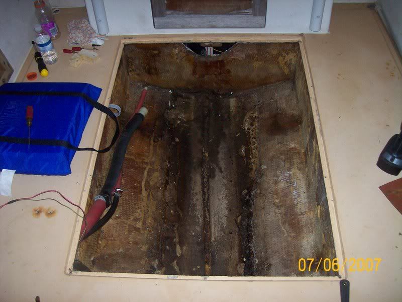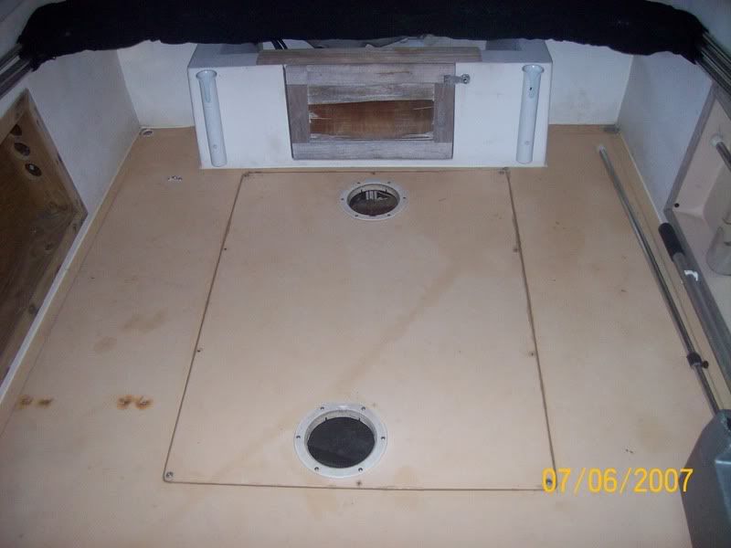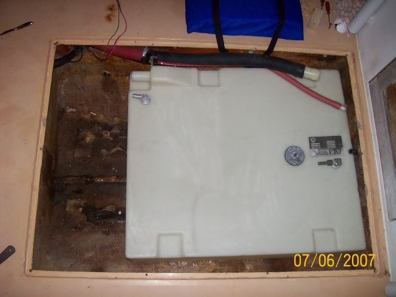 Getting ready. ![]() Hatch removed. ![]() Out with the old. ![]() In with the new. I have enough room in front of the new tank for a 10 - 15 gal fresh water tank. (winter project) ![]() I used "Great Stuff" window and door foam, it said that it stays flexible. I ran beads from the sides toward the middle, leaving space in between for it to breath and allow water to run out if any finds its way in. Then I put a couple of globs, one on each side to help hold it, then I strapped it down. It seems very secure, we will see.