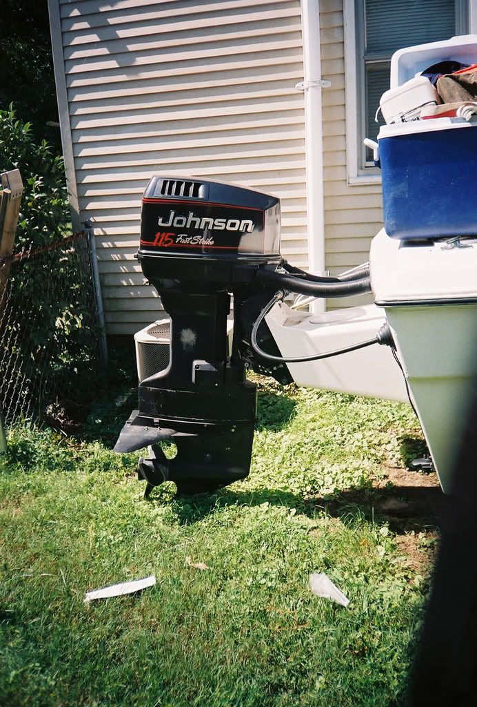 This is a picture of the motor and Bracket that is going to be put on my 1980 V-20. It is a 1995 115 Johnson Fast Strike that has never failed me and is still running strong. The bracket is a Stainless Steel Marine with an 18" set back. The boat is a 1974 Renkin that served me well untill I cracked the hull. I had her out in some pretty rough seas from time to time.She was a good one.