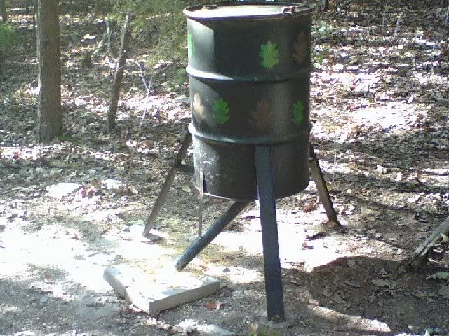 It is a 5ft x 4ft stand with 16ft telephone poles on the front leaned into a million year old cedar with the girth of an oak tree ;D We erected this stand on the ground and moved it into position using a rope, pully, and a Ford tractor. ;) The feeder was made by my dad. He made 5 total of these for various stands that we have. It has a funnel type deal in the bottom of the 55 gallon drum that allows the corn to go into the pvc and out onto the stepping stone. I like to pick on dad about the camo scheme he painted on there. ;D Close up view of my deer stand from the front: ![]() Looking up at the stand from the shooting lane near the feeder: ![]() And finally, the feeder **Look closely - its camo** ;D ::):