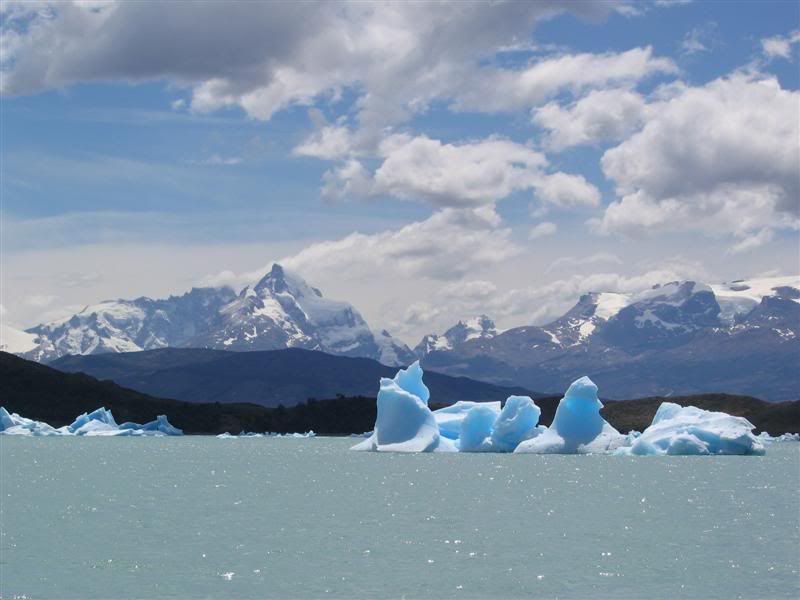 Here's one of Spegazzini Glacier. It's over 400 feet tall and goes up for many miles into the Mts. Saw many glaciers and icebergs. They seem to be alive with the noises comimng from them. We saw huge hunks falling (called calving) into the water, what a sight!