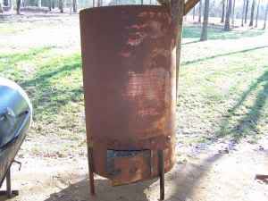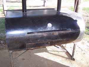 This joker is AWESOME! Even came with a HUGE burn barrel to make coals with. Not only that but Chad (salesman) talked him into throwing in a big pile of split hickory wood!! These are the pics from Craigslist. You cant' get a good read on the size of this barrel but it is about an inch shy of 6ft tall and WIIIIIIDDDDDE! Big ol bars welded in at the bottom, the very top was left solid and a "window" was cut in the side part of the barrel near the top for the smoke to escape. It can rain all day and the fire stays uneffected - ingenious. You motorheads would get a kick out of the hinges on the smoker lid. They are from the hood of a Chevy truck! The lid lifts and stays up just like a hood on a truck! Slick paid $475 for the smoker, the MEGA barrel, and the hickory. Please don't call the law on us. Pulling that thing to Slicks house last night I told him I felt like we had a goldmine sitting on that trailer. We were both like kids in a candy store!! We start cooking Sunday morning...prolly about 50 half chickens, couple of racks of ribs....maybe fry up some striper....I don't give a $hit who wins the superbowl!! HEEHAWW!! ![]() ![]() ![]()