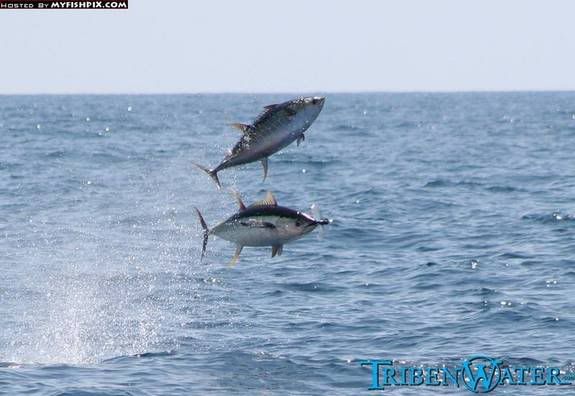 that incredible photograph of the pair of yellowfins jumping out of the water? trying to find it. cant. one had a flying fish in its mouth.