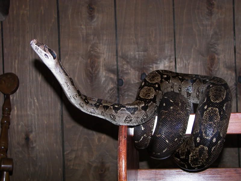 I finally go tsomething Ive always wanted. I acuired a red tail boa just over 6' long. Ive know the snake for several years as she belonged to a buddy of mine. I even helped deliver her babies once. Anyways she has always been a sweetie and loves people. He had to go to IRAQ so he left it with some relatives to "take care" of her. His wife called me the other day and said they didnt want to anymore and if I would give her a good home I could have her. Im glad I got her becasue she wasnt being taken care of at all. Filthy feces ridden cage, no UV light, heaters, etc. The stuff was all there they just didnt keep it up and working.