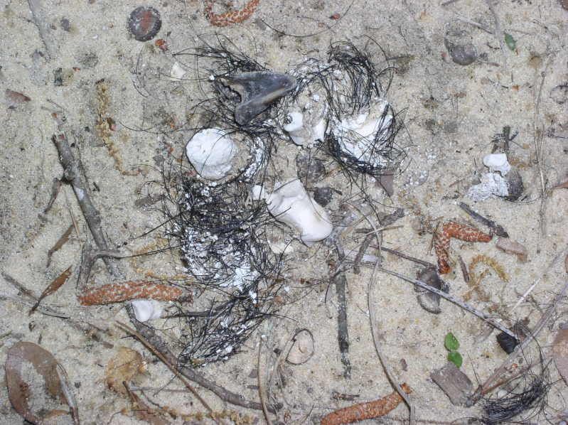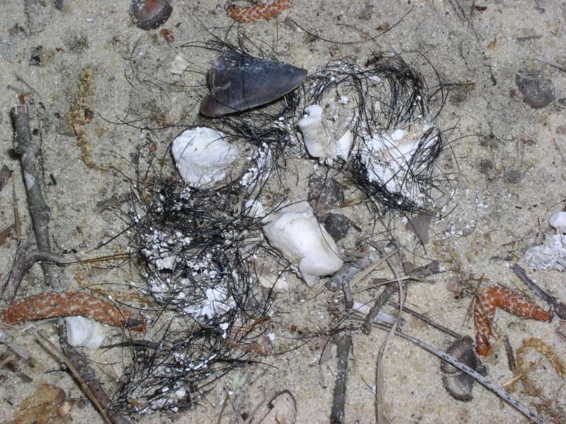 Seeing Coyote feces is always different, they eat everything. At every available chance I will send them to the happy hunting ground in the sky, but no luck today. I had to go all the way back to the truck to get the camera, this sparked even my interest. ![]() What you are looking at is the undigestable remains of a very small pig with black hair. The white things are vertebra and other bones. Look at the top center black thing, that is a hoof. Now I know why they HOWL!!!