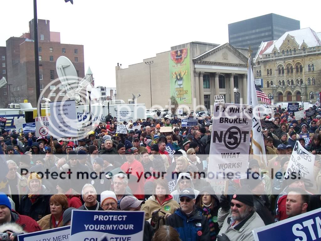 I am jealous. I don't have collective bargaining rights. My pay is less than it was in 2006. I am happy because I still have a job and a family that I love and cherish. I do not have a dog in the fight, this is my observation only... Used to be, any government job (city,county,state,federal) never paid that well but you could rely on job security and benefits. Nowdays, pay for government jobs are outpacing the private sector. Something will have to give in order to attempt to balance the budget at every level of government. The choices should not be made in haste. Where would I start? I have some ideas but I can offer this, our blue collar workers like our firefighters police and teachers are not the problem. They are barely making a living wage now IMO. Besides, what jobs are more important or absolutely necessary? The problem in my mind is the upper level government employees that are bringing home six figure incomes plus the benefits and retirement. You know the cronies that were appointed that have a job that defies description. For every one of those jobs you ax, you could hire two or three blue collar workers or put a serious dent in the deficit. There could be far fewer six figure guys in the lineup at every level of government. The issue there is they don't really need collective bargaining, they are the annoited ones. The blue collar guys could easily do the (easy lifting) management guys work. They have been doing it for years anyway.