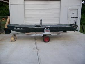 HELP! *Trying to decide if this is a good deal. *Its a 14ft flat bottom jonboat with trailer. *The trailer tongue appears too short in this pic. *Question is, #1 could it be modified by adding a couple of feet to the tongue? *And secondly, is the package worth $400 (electric trolling motor not included.) *I want it for duck hunting on the lake. *I can pop my little 9.9hp on it and go. *Maybe even rig it out for flounder gigging. *That would be fun *8) *The guy wouldn't sell it for $400 back in june, but now he says he will. *What do ya'll think? *Deal or no deal? *I've asked him if the trailer was titled and waiting for response.