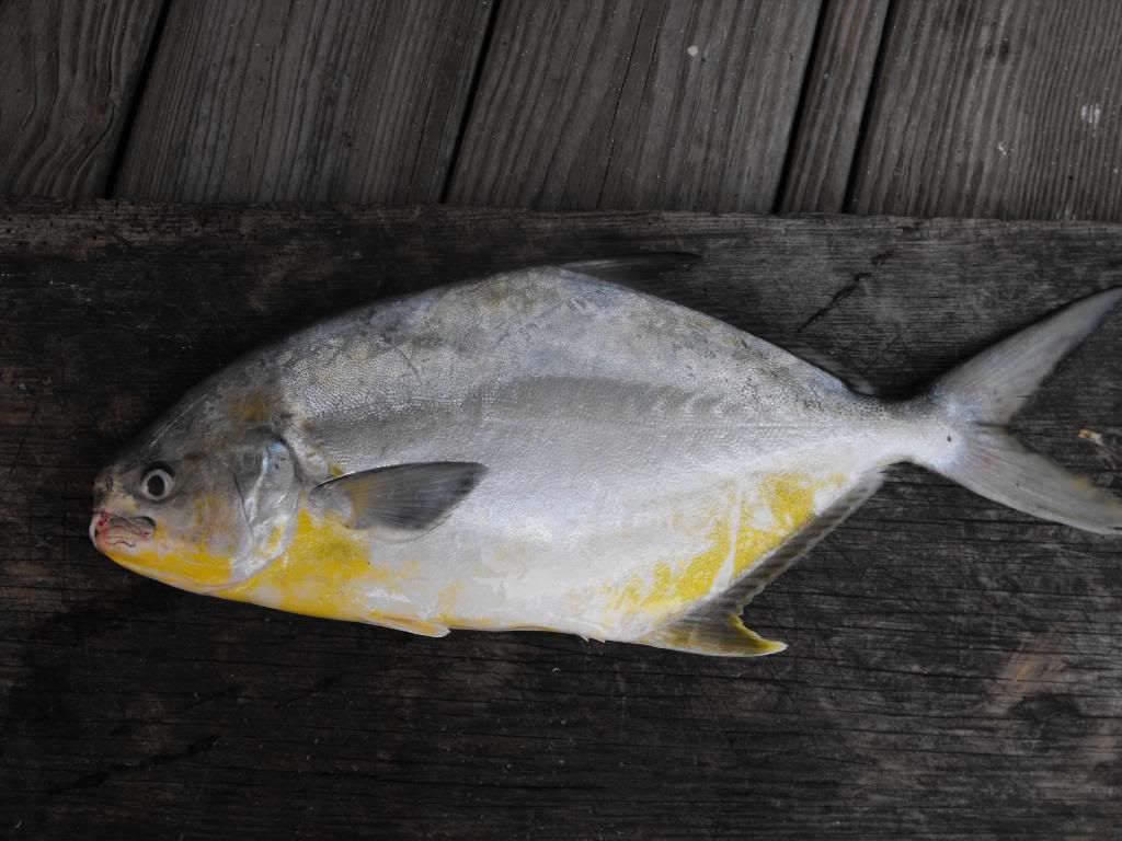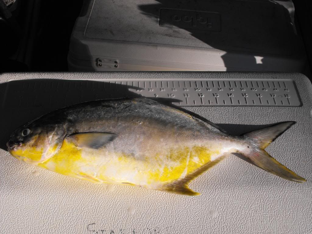 What a coincidence. I caught a Pompano at the mouth of the Suwannee this weekend. No pics but yours is much larger. Mine was 12" to the fork. My first. We caught sandtrout and whiting out the wazoo but were mostly small. (ended up with a mess to eat) Mom hooked and fought a 5' long salt-water gar all the way to the boat then we had a huge school of black drum move in on us. Must have been spawning because I emptied my box in attempt to hook one to no avail. They hung around for 2 hours. I posted here to "catfish" off your picture, hope you don't mind.