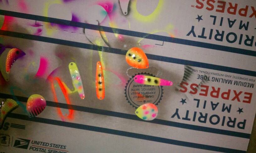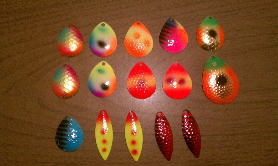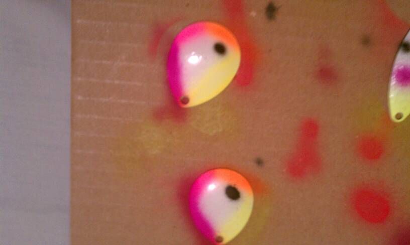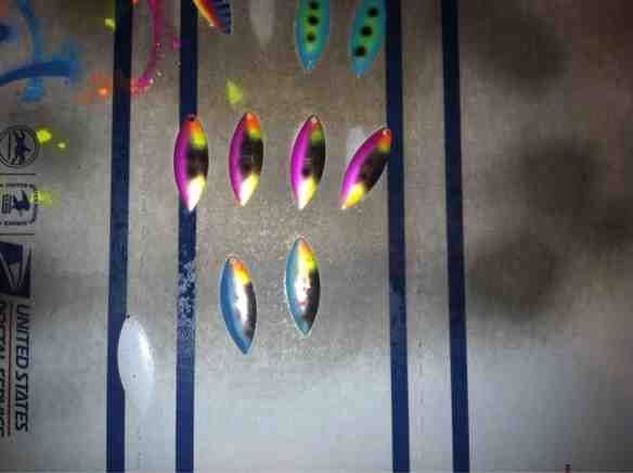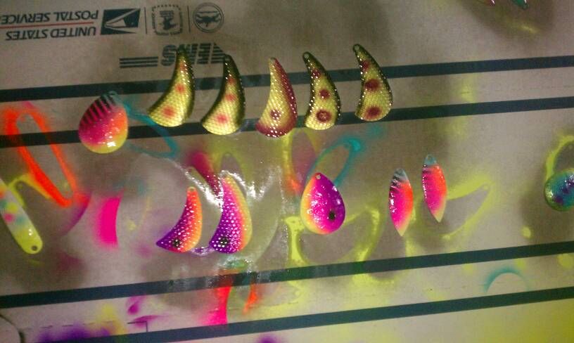 my wife bought me an airbrush and ive been painting some blades and spoons for the upcoming walleye season on Erie... spring cant come soon enough
