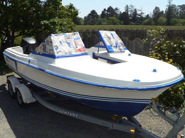 however, what about overspray on that botom? :o I know it doesnt seem like it would be an issue, but epoxy and urethane based paints are very sticky and I would mask it just to be sure. Get some of that masking film from lowes that has the tape and drop cloth in one. Its pretty cool stuff. Just run it along your rub rail, unfold it down over the side and put a piece every few feet to hold it there. 8) Nice work! ;)