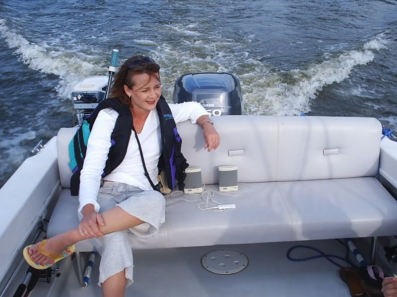 Anyway some of you may remember a little while back when he posted a pic of his bench seat from his V20, well we made a deal and I drove down and picked it up. *My wife is thrilled - I like it because I can take it out or put it in depending on if I'm fishing or cruising. *Plus when I went fishing yesterday, we took it out and sat it on the floating dock. *It was like having a couch on the floater! *We are really getting some good use out of it as you can see. *It has a welded stainless steel frame. *I wrapped some vinyl around the legs to keep from scarring the deck. *Taped it on redneck style with that blue 3m masking tape *::) *Better than drilling holes in the deck *:o *Just thinking about that makes me wanna puke!