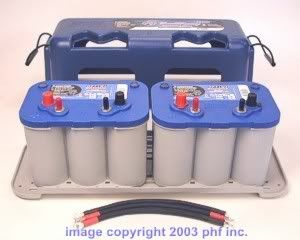 I've heard nothing but great things about Optima's... a bit pricey though. I'm considering going with the Troll Fury setup w/2 D34M's (dual purpose) or should I go with a designated starter and deep cycle? I love the case setup houses both batteries. I found D34M's for $149.99 w/free shipping, found the case on another site for $25, but shipping is $22 for a plastic box??? Still cheaper then Ebay. I want to hook the batteries up through a 4 way switch and an Isolator. With an Isolator there is no need to worry about switching from number "1" to number "2" batteries, turn to "1" when starting engine, then "off" at end of day, never have to worry about draining both batteries or switching to number "2" when anchored/hangin out, always charging both batteries while underway. The only time you would use "both/all" is if motor will not start on #1. Also, you can't fry your alternator by turning the switch off by mistake while engine is running. Without an isolator if you forget to turn swith off at the end of day the stronger battery will drain into the lower battery.