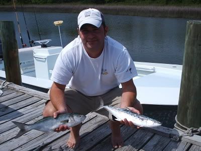 Day 1 - Wednesday 5/10 Got out early on a 21ft custom built CC that a friend let us borrow. *Nice friend huh? *;D Headed to the inlet with 2 dozen mud minnows hoping to make something happen. *Tried the flounders for about 30 minutes and nothing but a couple of small blues. *Decided to start trolling 00 clark s-poons. * Put out two on different sized planers. *Instantly hooked up on the small blues inside the inlet. *About 3 spanish thrown in and a few others lost. *Kept a few blues and the 3 spaniards for 2 hours fishing, not bad. *Later we realize that one of the s-poons had lost its hook - no wonder we couldn't hook up on that rod *::) ![]() Went back out around 5pm to the same spot. *BIRDS! *With Spanish on top! *Fished less than 2 hours and had plenty of Spanish with 5 fish over 20". ![]() Day 2 - Thursday 5/11 Offshore! *Left the dock around 6:30 headed for Big Rock. *Nice and calm till we got past the shoals. *Downhill from there. *Big rollers offshore, but the fish didn't mind. *Lines out at 9am, fish on at 9:15am! *40 lb tuna! *Lines back in and steady fish from 9 - 11am. *11:30am hooked up with a dandy double of 18 lb mahi. *With the weather deteriorating, we immediately started the slow ride back in with a following sea. *Me in the orange shirt. ![]() ![]() ![]() Day 3 - Friday 5/12 Offshore again! *Weather was slick calm all the way out the whole time. *Very fishy looking weedlines with beautiful water, but could only entice 2 mahi to bite and lost one of those. *Bummer. ![]() Pics of the boat (yes that is me in the reflection, and yes that is my Homer Simpson hugger - Doh! ![]() ![]() ![]() ![]() Came back home Saturday morning. *It was a great trip with a crew of great guys. * P.S. Skools, the boat is at Town Creek and its called Black Smoke if you want to check it out.