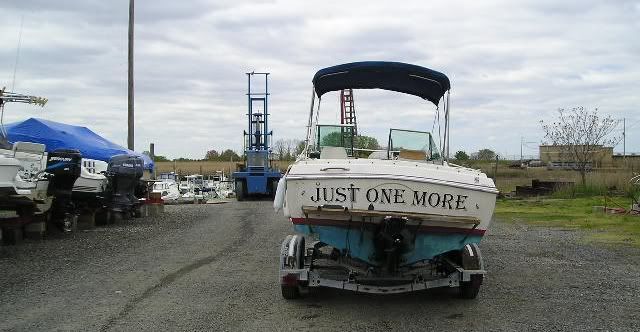 Well I finally got her home from NJ. What a long weekend that was. But I did manage to get her into the water in NJ. She floats. She runs!! She's MINE!!! Her name, Just One More seems fitting since I already have another V-Step20 (Project boat). But this one runs already!!! And it still seems like a good deal... so it averages down my costs on the 84' Project boat (yes I'm rationalizing things to myself.. lol). Now let me see if I can follow MJ's Photobucket instructions.... they're already on the Gallery. ![]() ![]() ![]() I wasn't thrilled with how the guy loaded her off the lift, but she made the trip home okay. ![]() Okay, let's see if this works.