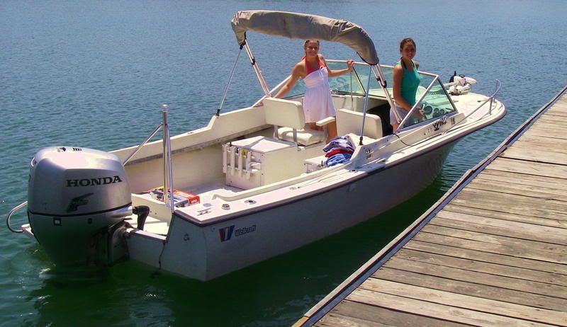 My new High School Graduate brings Reelapeelin to the dock in preparation for a day on the lake ... note V-20 in Tow-Mode... 8) ... no rod-holders or bait-tank ... just ski-pole and wake-board ... it's truly the "everything" boat ... ;D ...