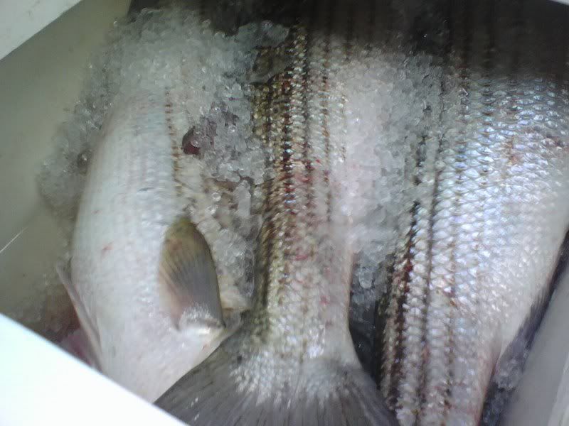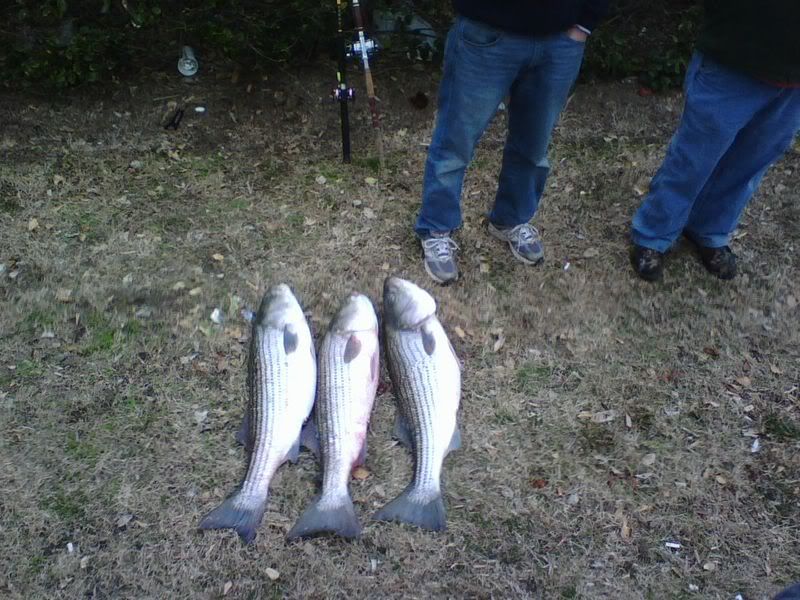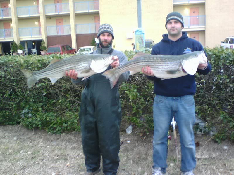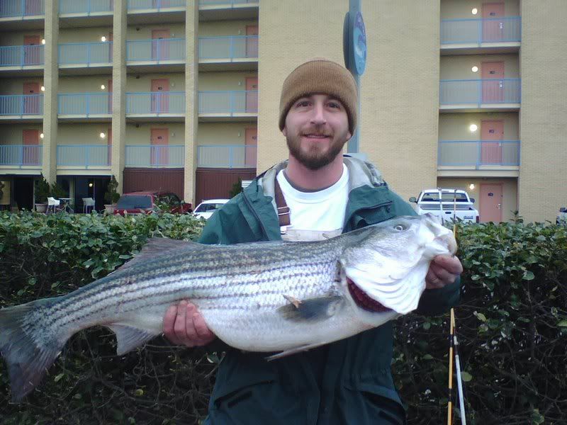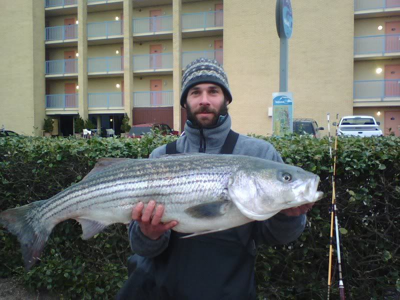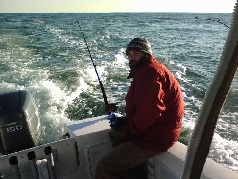 Friday 1/25 After getting in before midnight we worked to get things ready for morning. The wind was slated to blow pretty good until around lunch time so we knew the prospects of getting out at sunrise were pretty slim. Well, we were right. The wind didn't lay until around 1pm so we made it on the water around 2ish. From there we ran south toward Sandbridge. Pulled it down a few times to see what was there and just a cold, dead, 38 degree ocean. Also, very few boats in sight. We kept running knowing that we couldn't go very far due to it being so late. In all we went around 12 miles south before putting the lines in and trolling around for a couple of hours. Not a nibble so we packed it in and headed for home. The other 2 boats with us didn't do a bit of good either. Saturday 1/26 Weather man said it was going to be NICE on Saturday. With all the great info TLB88, garagenc, and stillrunning gave me we knew we had to be up early if we expected to hit the water at a reasonable time due to all of the weekend warriors in town. We shoved off early and arrived at the ramp at 5:53 am to find a line backed up the road just a little ways - maybe less than 100 yards so we got in line. The two other boats with us did not get such an early start. When they arrived at the ramp about a half hour later they were backed up almost to the bridge so they went back to the room to let things die down. I don't think they got on the water until 9am or later. We were able to get the boat in the water around 6:30 (I think). Here was the view going out of Rudee at around 6:30 ish: ![]() We were in line with the fleet and knowing how cold the water had gotten everybody was going south so we went with them. We ran...and ran....and ran....and ran. At one point someone came on the radio and said, "Uh, guys, where exactly are we going? To Florida?" We all got a kick out of that! Then a little later as we were nearing 30 miles south a guy came on the radio and said, "I'm 5 miles north of Corolla light (NC) and all rods are down - you'd better get here quick!" Finally, something to be hopeful about! Down that way the water was around 41 degrees which sounded alot better than 38 to us. We stopped about 2 miles before Corrolla light and in just a few minutes we saw a school pass under the boat on the Garmin 250. Still no bait, but at least we saw some fish! I immediately tell my crew to get the lines in. In about an hour, the boats started to pile up in the area. We marked some scattered fish and by 9am we had lost 2 fish due to poor hookup. Then just a short time later the left wwb went down and I began to battle. I eased in a nice 20lber to the net. Ok 1 for 3 at this point. Next we are able to get another knock down on the same rod. My buddy Garrett took the rod and began the long arm aching battle back to the boat with a nice 22 lb fish. So we are 2 for 3. Then we have a double hookup. Lost both to poor hookup and/or angler error LOL - inside joke. Next up is Chad - same rod, man they like the wwb - and he battles another 22 lb fish identical to the last to the net. Ending the day at 2pm to beat the rush at the ramp we went 3 for 7 on knockdowns all before 11am which was kindof a bummer since we felt we should have almost limited with our 4 man crew. During all of the action we are calling our other buddies telling them to get down here. After they made it in the water they had made the decision to ride north to Cape Henry to check it out so they didn't make it back down our way until after 11 or 12 am, which sadly was after the hottest part of the bite. They ended up going 0 for 4 and the other boat went 0 for 2. Here are some more pix: Can't tell but there are alot of boats in this pic: ![]() ![]() Fin Galley - charter boat. We got a little close LOL ![]() ![]() Garret - aka G-Money ![]() Overcast on Saturday but flat slick calm. Able to run 30 mph! ![]() ![]() Mr. Heat/ Buddy heater paid its dues. We were toasty warm despite the cold air temps outside. First mate Cory on the helm as we trolled. ![]() ![]() The catch: ![]() ![]() G-money ![]() G-Money and 1st mate Cory (they are brothers) ![]() Left to right, Chad, me, G-Money, and Blue Runner (the boat). ![]() Captain and proud owner of the Blue Runner ![]() ![]() We had great fun even though the fish didn't want to ride in the boat for some reason. I guess we can't complain too loudly since we did bring back 64 lbs of rock in my fishbox