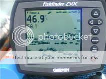 i started fishing from Vermilion because of the 30 fish limit they had in place over the 20 on the west end of the lake.and Vermilion is alot more laid back than the Port Clinton area. my 1st boat on erie was a 17' Monark Pro.great boat and it handled the water pretty well(had to ease back in a time or two in 4ft'ers)but i just wanted something that would handle erie with a little more ease.last fall i took 2 weeks off from work but only got out 4 days.that sustained north wind last fall during the last week of september and the 1st week of october really scattered the perch.but we did limit a couple of days before they shut down. the weather does change fast up there and i certainly do respect it.i use to fish w/ my older brother who ran a 24' thompson out of tibbles marina on east harbor.he was always safe where the weather was concerned.it isn't something to mess with. most of the work i've done on mine has been cosmetic.the previous owner had carpet velcroed to the deck and that had to go.once i had the deck looking good again i cleaned then re-oiled all of the teak wood except for the trim around the rod holders.with that i am going to replace it.i bought some teakwood so i can make it look new again.while doing that i'm going to remove the rod holder inserts,clean and oil the rod holders and re-paint the inserts.a new lounge seat and the interior should pretty well be done. i'm in the process of locating all new decals and striping for the exterior and after those are installed all that will be left is a good buffing(hopefully!!) i like the room and the gunnel depth of the boat for fishing and,it's a pretty darn dry ride on erie too! i'm glad i ran across this site.lots of great information and ideas here. i've been looking for new inserts for the drop in containers on the stern of the boat and found a few ideas on the site last night. thanks for the welcomes! Jeff here's a few pics of the boat.these are ones the previous owner took.i'll post more when i get a chance.there's also one of the fishfinder screen from lake erie last fall.the weather and a strong north wind had shut the fish down but they certainly were there! ![]() ![]() ![]() ![]() the fishfinder screen when they weren't hitting!