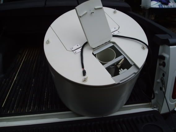 ![]() pump and air infusor in stand pipe ![]() top stays put w/ 4 plastic wing-nuts ![]() lid-stop...makes closing easier ![]() Bait access lid ![]() stand pipe/ filter access and air control ![]() all closed up ![]() Mostly used for freshwater Blue-Back Herring and also many times for saltwater bait; menhaden, mullet and whatever else comes back in the cast net :o ...
