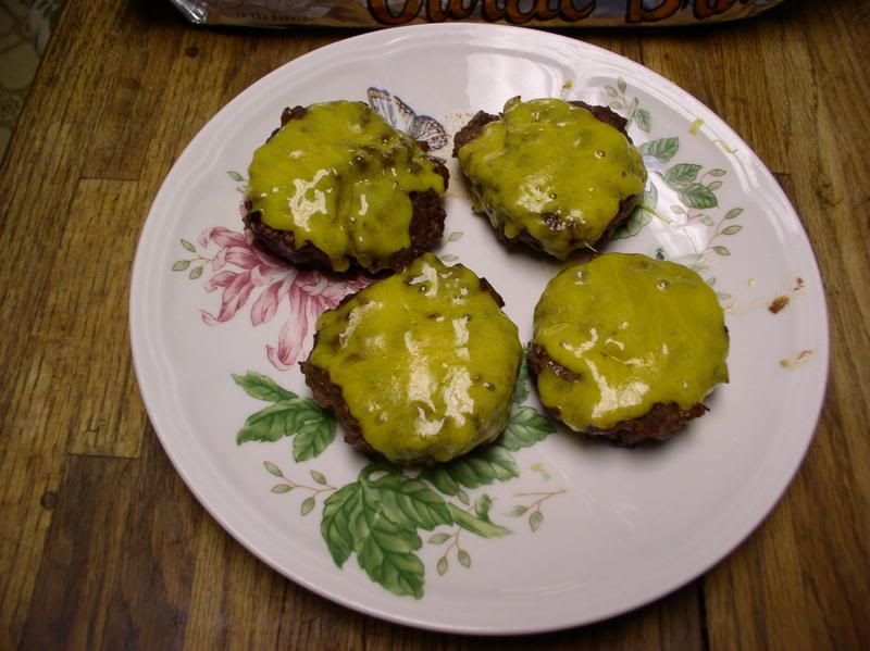Out of one package of 93% lean a lil over a pound of meat I can pat out 6 or 7 patties - most of the time 7, it all depends. Then I like to marinate in some worscester sauce and of course Mckormics steak seasoning after they are patted for about 15 minutes or so. Then once on the grill cook on high. As one side gets done, I have the cheeze ready on stand by. Before I apply the cheeze, on each piece I fold down all 4 corners so that the cheeze will sit right on top of the burger without overlapping onto the grill top. Some cheeze still inevitibly makes its way onto the grill top as it melts but not near as much as not folding down those corners! The finished product: ![]() Makin myself hawngry! ;D