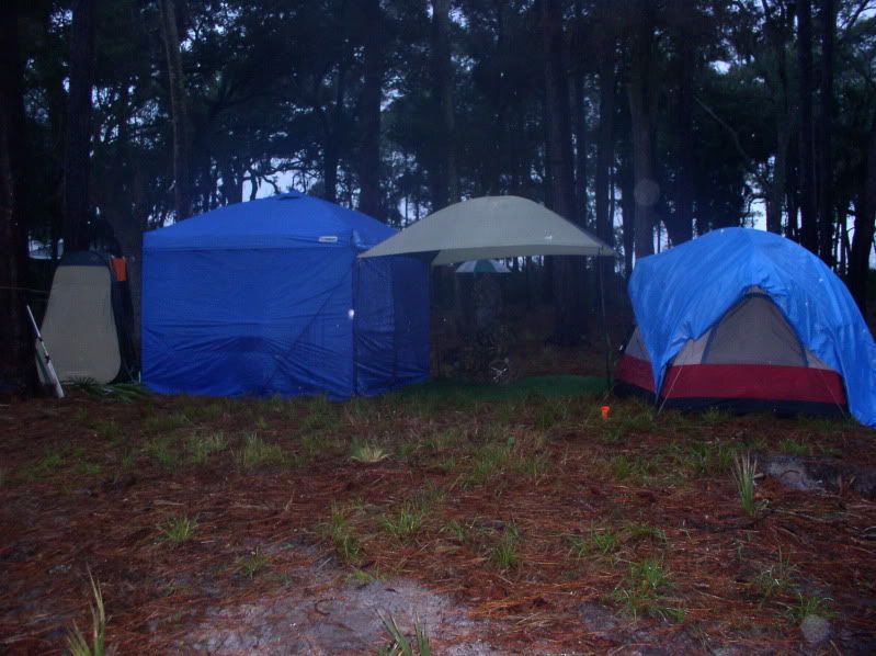 Packed the boat and was ready at 8am on Wednesday, figured I might as well crank the motor to make sure it would run. It would spin over but not fire. After pulling the plugs and drying them off 3 different times, I realized it was oil and not gas keeping them wet. I ended up disconnecting the fuel bubble and draining ALL six carbs that was full of oil. Once I did that, checked the filters and primed it, it cranked up ran fine with the exception of it smoking, letting it clear the cylinders of excess oil. At 9:30am, off down the road we go. 2 blocks from the house, something didn’t feel right with the trailer, so I stopped to check the wheels. They were contacting the fenders, got TWO broken springs. Removed the fenders and pulled it back to the house, off to the hardware store for springs and hardware. After replacing them and eating lunch, it’s now 1:45pm and I’m bolting on the last fender, the Civil Defense horns go off all over the county. We now are under a tornado watch, what else can go on today?? By about 4:30pm seems all is clear, figured we would not have enough time to get to the ramp, get to the island, set up camp, etc before dark. Well this might be a sign not to go today, so we leave Thursday morning. We got to the island at 9:30am set up camp and were off to do our (now) couple of days hunting. If you haven’t been there, it would take too much time to explain all the little stuff that just didn’t mesh. Temps ranged from 35 to 70 degrees with one full day and night of rain and 15 to 20kt winds the whole time. We did at least see a couple of deer each but had no good shot opportunity. While talking to the resident manager and telling him of our first day’s problems, he let me know it could have been worst. A father and sons group (from Atlanta) almost bought the farm, they had attempted on Wednesday to get to the island, swamped their boat, lost everything except the guns that were in floating cases. I felt better about listening to the signs and not going till Thursday. Numbers for this hunt was about 50 hunters and about 25 deer taken ranging from a 130lb 9 point (my cousin took with a smoke pole), a 122lb 11 point and ranging on down to some near 25lbs. We left the island about 10:30am Sunday to the welcome of 70 degrees and fog with a visibility of about 100 feet. Seemed to take forever to get through the sound and up the intracoastal where at one point we met a couple of snowbirds heading south. The 40 foot or so boat was throwing about a 3 foot wake (which was no problem) but the yankeejackassSOB behind him in his 30 foot or so boat was throwing a 6 foot wake, which we could not see till we were on top of it. Water washed over the bow, up the windshield, up and over us, gee thanks asswipe, we haven’t gotten wet the whole trip. Guess it could have been worst; at least we did arrive and return without any REAL problems. Sorry about no pictures except the springs and camp. Just had too many distractions this trip. ![]()