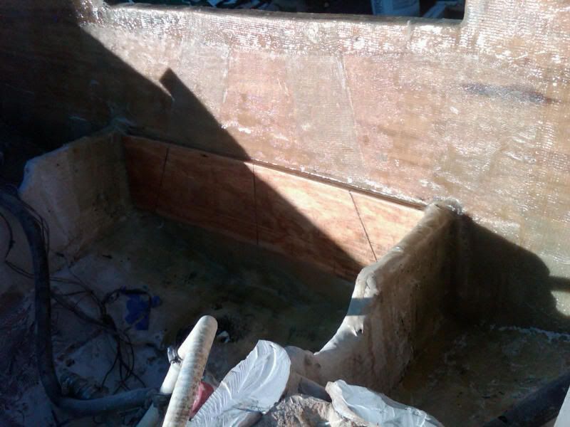 Nice, glad you added some more glass. Now tough as nails/never need to worry with it again. You have a bulkhead that I didn't have on my 1983, just in front of the fuel tank. I installed a 13 gallon fresh water tank and pump there. No ill effects on handling that I could see. I moved some weight up front for the addition of a bracket, hoping the balance was right. Is there enough room to run the fill and vent lines under the liner? or are you going to do something else?