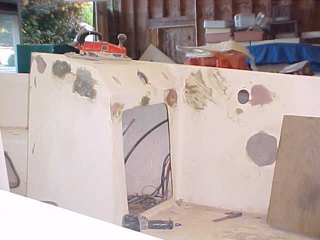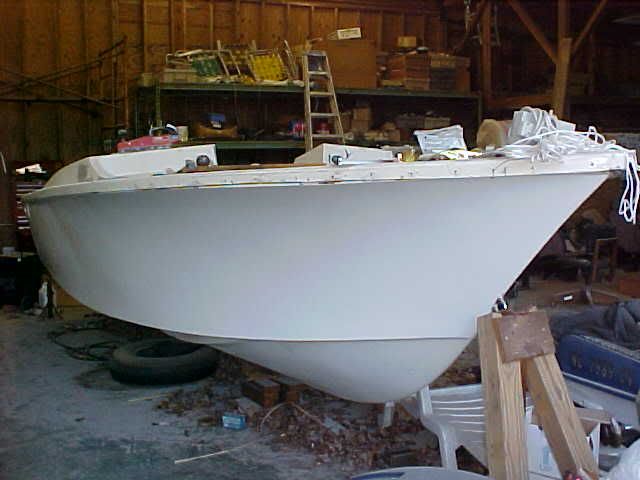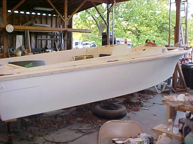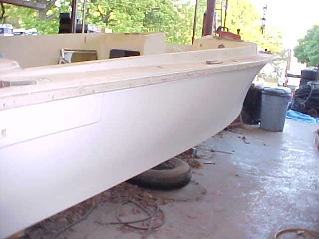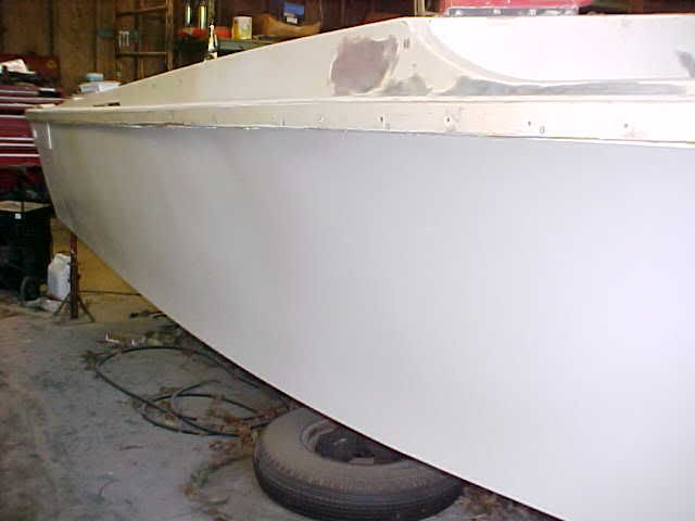 More pics of work this afternoon primed one side of the boat and other side sanded some micro ballons epoxy spread in the bad gouges.