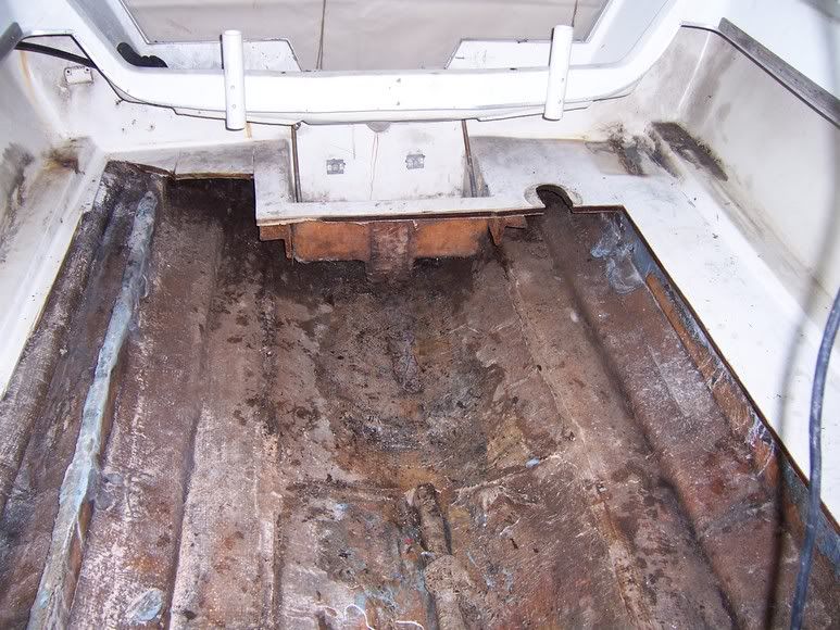 I noticed the transom has rods run to the bilge area. That's a sure sign the transom is shot. You'd be better off to cut the whole floor out transom to the dash and all sides. You'll have to cut the cap to put a new transom as well unless you are removing the whole cap.
