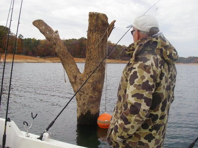 A while back my buddy who has his boat on Lake Hartwell was runnin' between the channel markers in 58' of water when his boat LAUNCHED into the air, kickin' the motor all the way outta the water...I'm talkin' about a 24' Everglades w/a 250 Verado that went airborne!!...that was several months back...w/the continuing drought conditions we're having around here and the lake continuing to drop (now 23' below pool) this is a more recent shot of that same stump...when he hit it, it was 1/2" under the surface...no way he coulda seen it comin'...