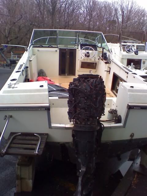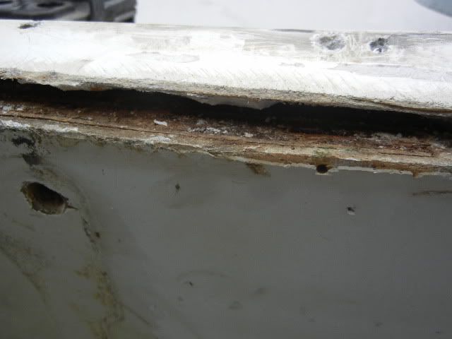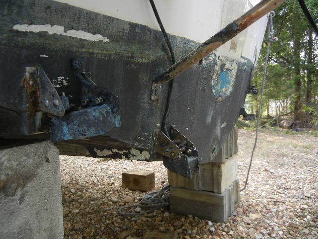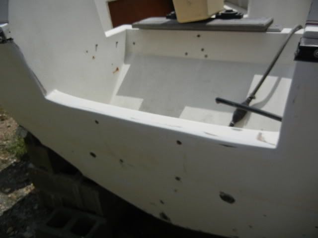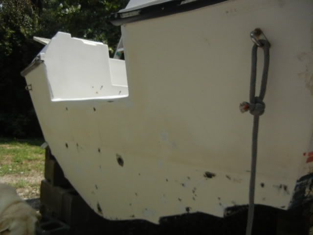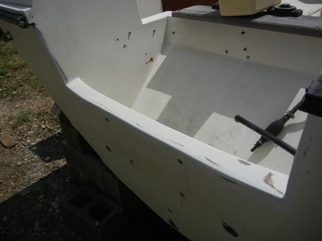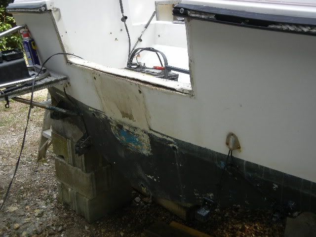 Something I've been wanting to do for long time...remove the aluminum cap from the transom top and smooth it over... Before...   Take a look at the two Clamshells just above the waterline here...the PO drilled these two holes thru the transom, ran several transducer lines thru them on both sides, left them open, no caulking or anything and put these clamshells over them like they would somehow keep water out...not too good...  Crammed a BUNCH of structural filler in and under the gap in the cap...and then came back over it w/surface filler...   After  And then went to sanding...got all the screw holes, transducer holes, etc while at it...  After paint, it'll look a little cleaner still...the HEAT finally broke down here and looks like things can move along now...  As you can see, plenty more to do...have the primer and paint ready for tomorrow and will paint transom only for now....gotta get it ready to hang motor soon and then will finish up remaining hull work...but the aluminum cap is in the Sptbg Co DUMP by now...