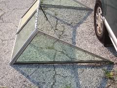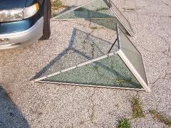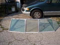 The center section has been replaced with plexi-glass by the previous owner. the frames have some corrosion from saltwater and one side has a hole where a windhield wiper motor was installed in the frame. I have no idea how you are ever going to be able to have these shipped in one piece but I'm all ears.