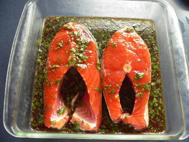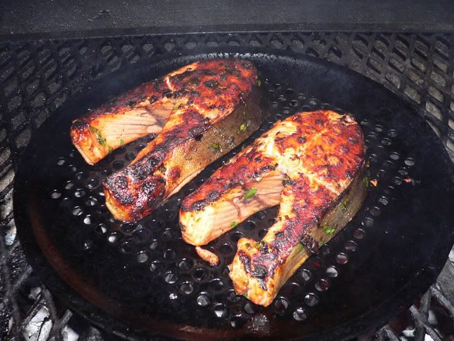 Small silver salmon that would have been released... well I released what was left of him after the fur bag grabbed him on the way in. "Swim", I said to him, "It's just a flesh wound." ![]() The one small 27" king salmon I kept for the day. ![]() Fresh salmon steaks in my secret marinade. ![]() Grilled FRESH salmon with alder smoke. Absolutely one of the best things around. ![]()