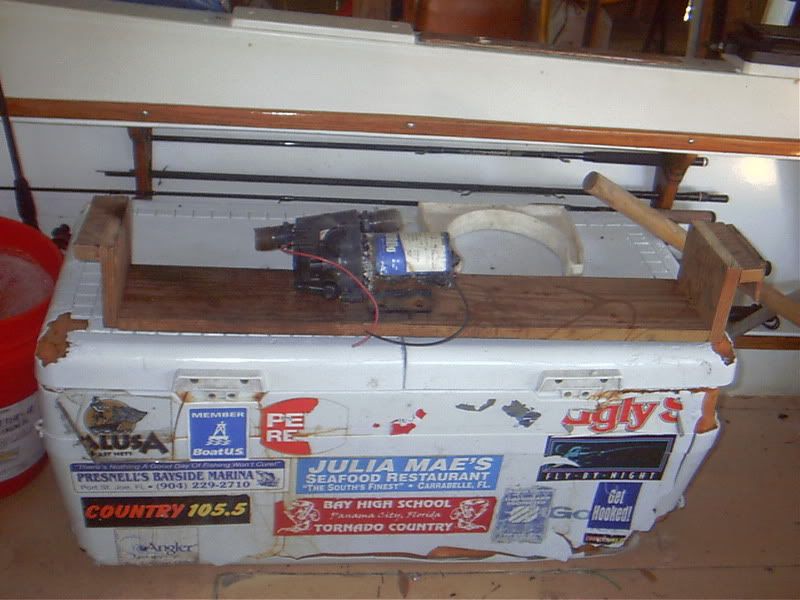 This is the old pump on a shelf I made to set it above the bilge pump, but below the deck level ![]() shelf out with pump. *I made it so it sets on & over the stringers, so no drilling to stringers ![]() Handyman, I put 3" pvc tubes between the gunnells and the outer hull below the rod boxes. *Capped both ends and put a tru hull in the cap. I tied both together at the pump, which is the lowest point of the set up. *I fill on the port side through the stand pipe under the boxes. *Capacity is about 5.5 gallons. *not very much but dosen't take up any room and is always in balance. starboard side ![]() port side with fill