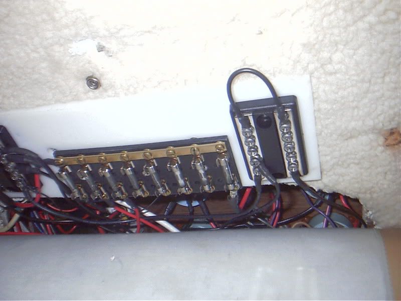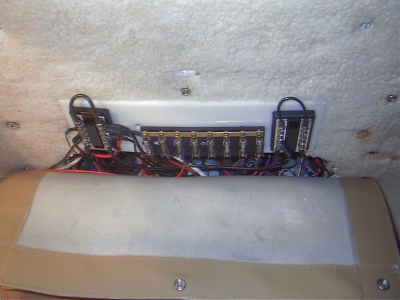 While i was messing around in the cabin, I also attempted to straighten out the snarful of wires under the dash. *I moved the terminal boards for + & - out onto the cabin ceiling and had a larger canvas flap made to hide & protect. *I still have a snarful but it is my snarful.